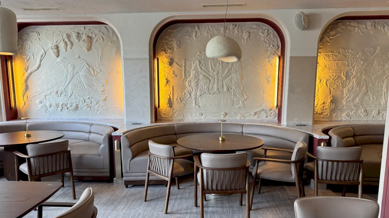 Baskı duvar detayları: Restoranın duvarlarında, bağcılıkla ilgili estetik figürlerle zenginleştirilmiş özel baskılar, mekanın ruhunu oluşturmakta ve benzersiz bir atmosfer yaratmaktadır.