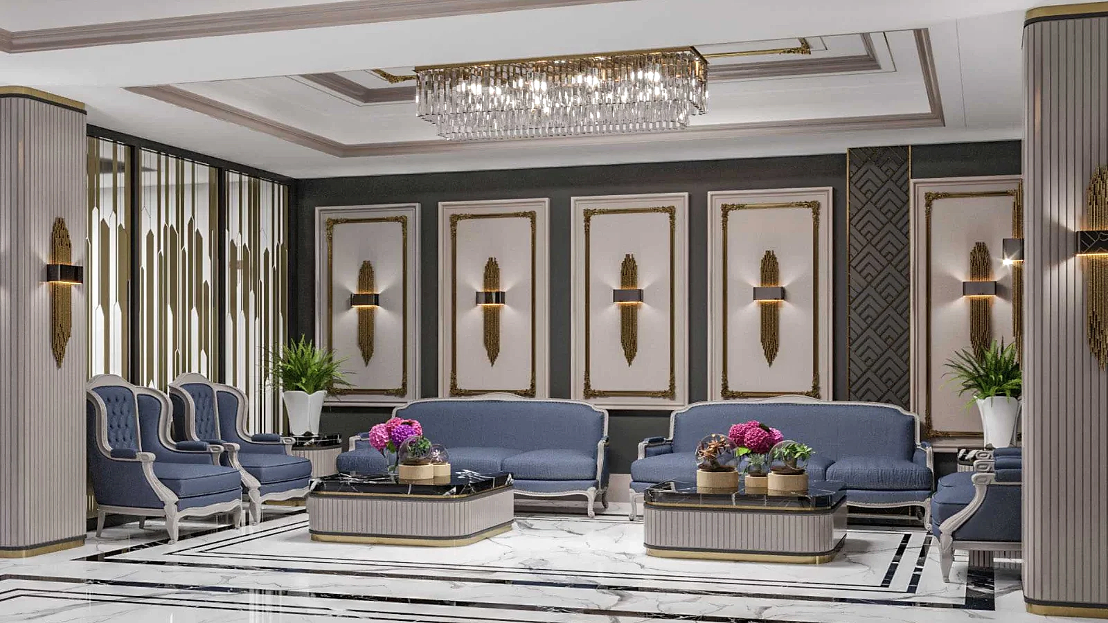 Tavan tasarımında tercih edilen katmanlı aydınlatma sistemleri ve dekoratif avizeler, mekânın yüksekliğini ön plana çıkarırken lobiye etkileyici bir görsel derinlik kazandırmaktadır. Aydınlatma kurgusu, hem gündüz hem de akşam saatlerinde mekânın prestijli atmosferini destekleyecek şekilde dengelenmiştir.