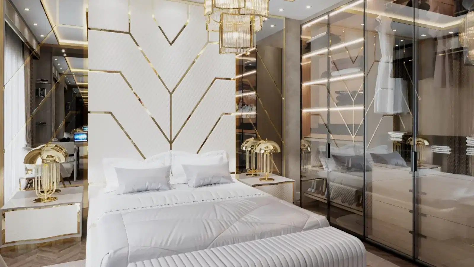 Otel odalarında ise konfor öncelikli bir tasarım dili benimsenmiştir. Yatak başlıklarında kullanılan özel tasarım paneller, metal detaylarla vurgulanarak lüks algısını artırırken, nötr renk paleti sayesinde sakin ve dengeli bir atmosfer oluşturulmuştur. Giyinme ve depolama alanları cam yüzeyler ve gizli aydınlatmalarla desteklenerek hem işlevsel hem de estetik bir bütünlük sağlanmıştır.