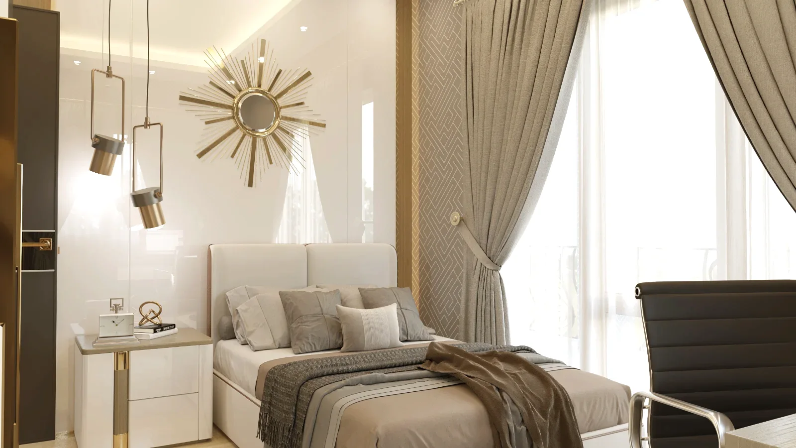 Yatak başlığında kullanılan ayna ve metal detaylı dekoratif aksesuarlar, mekâna zarif bir odak noktası kazandırır. Tekstil seçimleri, renk paletiyle uyumlu şekilde sade tutulmuş; mekânsal bütünlüğü destekleyen yumuşak geçişler oluşturulmuştur.