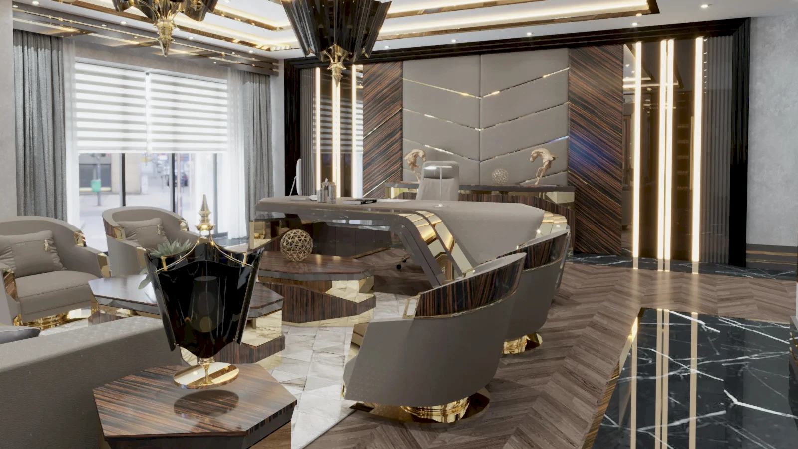 Tasarımda kullanılan ceviz kaplama yüzeyler, altın detaylı metal profiller ve mermer zemin geçişleri, mekâna zamansız bir lüks hissi kazandırmaktadır. Özel üretim yönetici masası; ergonomik formu, güçlü kütlesi ve detaylardaki işçilik kalitesiyle makamın merkezinde konumlanarak otoriteyi vurgulamaktadır.