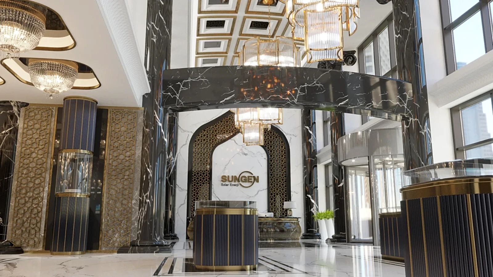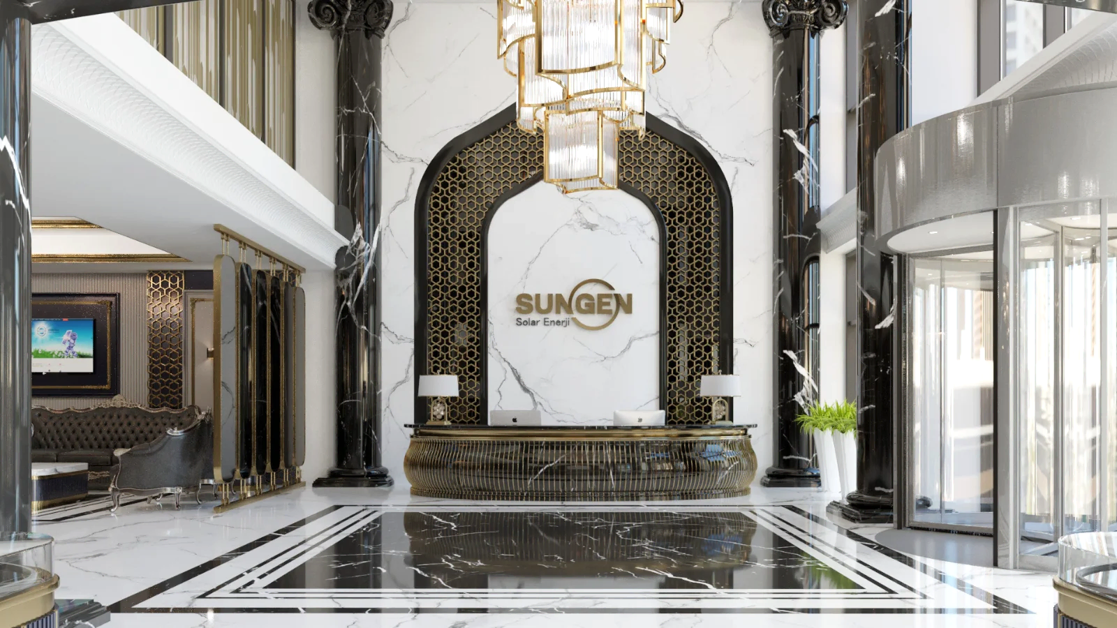 Sungen Solar Enerji için tasarlanan bu lüks giriş alanı, markanın kurumsal gücünü ve teknolojik vizyonunu ilk bakışta yansıtacak şekilde kurgulanmıştır. Mekânda kullanılan yüksek tavanlı mimari, simetrik kolon yerleşimi ve mermer–altın detaylı yüzeyler, prestij algısını güçlü biçimde destekler.